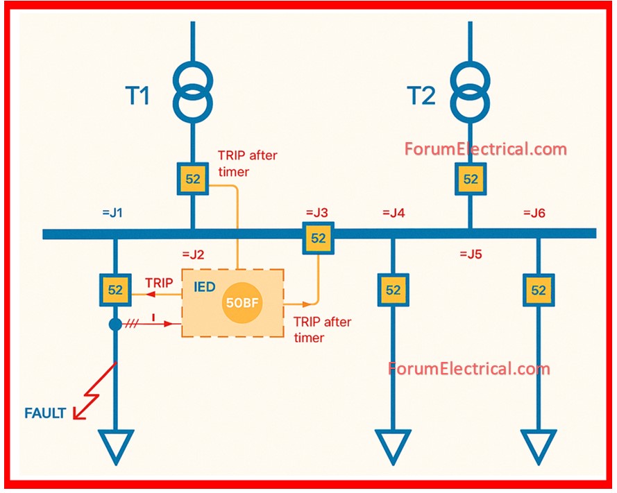 BFP then sends trip commands to pre-selected backup breakers [adjacent feeders, bus tie breakers (or) upstream breakers at the higher voltage levels] to isolate the fault using a different clearing path.